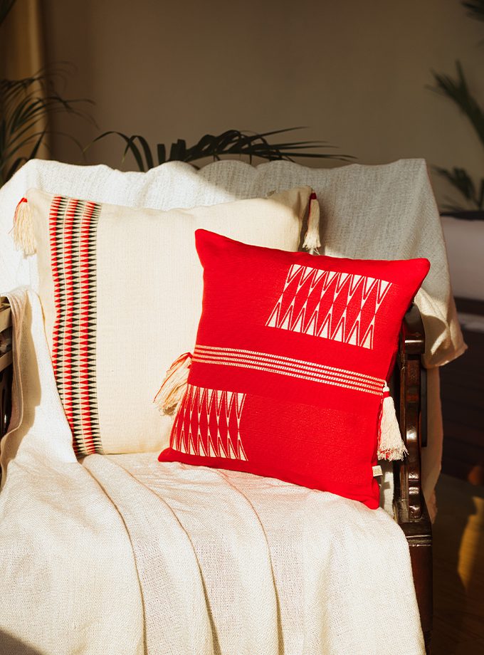 Handwoven by Aienla from the Ao tribe of Yaongyimsen, this piece reflects generations of tradition. Using the ancient loin loom technique, she weaves red and white threads symbolising strength and peace, creating patterns inspired by Nagaland’s mountains and the spirit of her heritage.